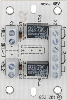 Relaisplatine zum Anschluss an Transistorausgänge. Spulenspannung 9…35 V DC. Stromaufnahme 6 mA bei 12 V DC, zwei potenzialfreie Kontakte, Kontaktbelastung max. 40 V / 1 A Versorgungsspannung erforderlich: true, Übertragung: Kupfer