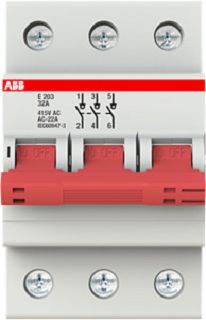 Lasttrennschalter E 200 für DIN-Schienen-Montage entsprechend DIN EN 60715 mit Bemessungsströmen von 80 125 A verfügbar und bedingtem Bemessungskurzschlussstrom von 25kA. Anbau von zusätzlichen Hilfskontakten S2C-H6R möglich. Schnelles Entfernen ohne Demontage der Phasenschiene möglich und Einsatz von unverlierbare Schrauben. Verriegelungsvorrichtung als Zubehör verhindert nicht zulässiges ON/OFF-Schalten. Zertifiziert nach Zulassungen VDE, CCC, EAC, KEMA