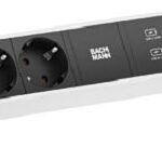 DESK 2 Steckdosenleiste Farbe: Weiß, ähnlich RAL9010 lackiert mit erhöhtem Berührungsschutz 2xSchutzkontaktsteckdosen schwarz 1xUSB C 60W Charger 1xCustom Modul leer Zuleitung 0,2m H05VV-F3G1,5mm² schwarz mit Installationsstecker inkl. Haltewinkel mit BACHMANN Logo verpackt im Karton