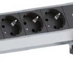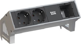 DESK 2 Steckdosenleiste mit erhöhtem Berührungsschutz Farbe: Inox lackiert 2xSchutzkontaktsteckdosen schwarz 1xCustom Modul leer Strom 0,2m H05VV-F3G1,5mm² sw mit Installationsstecker sw mit Bachmann Bedruckung inkl. Haltewinkel im Karton