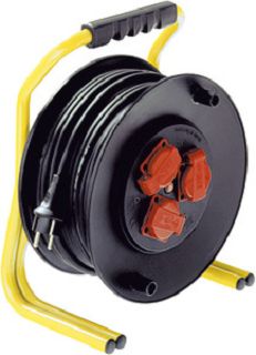 PROFI Kabeltrommel Spezialkunststoff 3 Steckdosen/Deckel + Thermoschutz mit Doppelrohrgestell ohne Kabel DGUV-I 203-006 konform Aderquerschnitt: 0 mm²