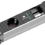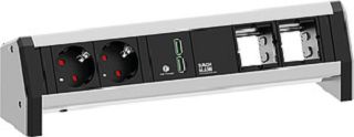 DESK Steckdosenleiste mit erhöhtem Berührungsschutz 2xSchutzkontaktsteckdosen schwarz 1xUSB Doppelcharger 5V DC / 3,1A mit BACHMANN Logo 2xCustom Module leer Stromeingang und -ausgang Installationssteckverbinder verpackt im Karton