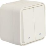 Jalousie-Serienschalter 1-polig, Aufputz, mit mechanischer und elektrischer Verriegelung zur Verhinderung doppelseitigen Einschaltens. Ausgestattet mit Steckklemmen und zwei Einführungen für Leitungen. Vollflächige Dichtung sichert die Gehäuserückseite ab. Einfache Montage und sichere Fixierung durch Bajonett-Schnellverschluss. Material: schlagfester Thermoplast. Ideal für effiziente Jalousie- und Rollladensteuerung.