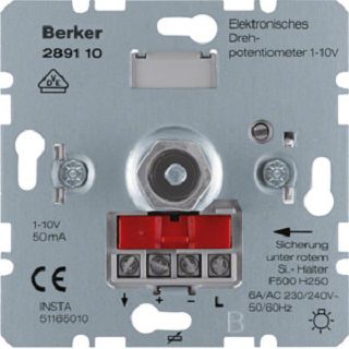 Elektronisches Drehpotenziometer 1-10 Volt: Eignet sich für die Steuerung von elektronischen Vorschaltgeräten und Tronic-Transformatoren. Features: Druck-Ausschalter, einstellbare Grundhelligkeit, kurzschlussfest, überlastsicher durch Feinsicherung. Installation und Sicherungswechsel ohne Abdeckungsdemontage. Optimiert für NV-Halogenlampen mit Berker Tronic-Trafo