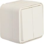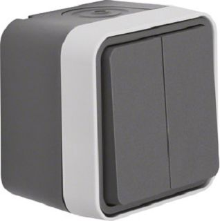 Serientaster für Aufputz-Installation, 2 Schließer, IP Standard 55, für Feuchträume und Außenbereich geeignet. Aus schlagfestem Thermoplast, grau, mit vollflächiger Dichtung und Edelstahl Gehäuseschrauben. Einfache Montage durch Bajonett-Schnellverschluss, inklusive Wago 2-Leiter Verbindungsklemmen. Spannung: 250 Volt.