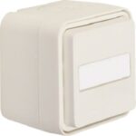 Wechsler-Taster AP W.1, beleuchtbar, IP Standard 55, inkl. blauem LED-Aggregat 230 Volt. Besitzt N-Klemme, Steckklemmen, zwei Leitungseinführungen. Beschriftungsfeld 50 x 16 mm für P-touch Band 12 mm. Symbole für Licht, Klingel, Türöffner enthalten. Vollflächige Dichtung, Montage durch Bajonett-Schnellverschluss. Material: schlagfester Thermoplast.
