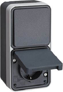 Kombination Wechselschalter/Steckdose Schutzkontakt mit Klappdeckel AP, W.1, grau