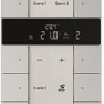 Frei konfigurierbares Multifunktionsbedienelement. Mit integriertem KNX-Busankoppler. Mit Beschriftungsfeld. Unterstützung der KNX-Funktionen durch innovatives Farbkonzept (gelb=Beleuchtung, blau=Jalousie, orange=RTR, magenta=Szene und weiß=neutral/keine Funktionszuordnung) oder Standardbeleuchtung rot/grün