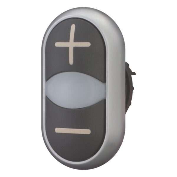 Doppeldrucktaste, Sortiment: RMQ-Titan, Einzelgerät, Bauform: Tasten und Leuchtmelder vorstehend, tastend, Beschreibung: Vorsatzlinse weiß, Tastenplatte: schwarz, schwarz, Tastenplatte beschriftet, Schutzart: IP66, Frontring Titan, Anbindung an SmartWire-DT: ja, mit RMQ-SWD-Anschaltungen, Frontabmessung: 29,7 x 54,7, Normen und Bestimmungen: IEC/EN 60947, VDE 0660