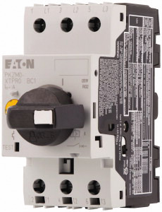 Motorschutzschalter mit abschließbarem Drehknebel nach IEC/EN60947, 3-polig Baugröße PKZM0, mit einstellbaren Überlast- und unverzögertem Kurzschlußauslöser, phasenausfallempfindlich, Schraub und Schnappmontage, mit Schraubklemmen, Kappeneinbaumaß 45mm, Bemessungsbetriebsspannung Ue 690V, Schutzart IP20, fingersicher nach VDE 0106 T. 100, Zubehör: Hilfsschalter, Spannungsauslöser, Schalter Modul, Clipsplatte