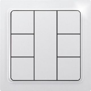 Funk-6-Kanal-Taster im E-Design55, 80x80mm außen, Rahmen-Innenmaß 55x55mm, 15mm hoch. Sehr leise und mit Batterie (Lebensdauer 5-8 Jahre). Der Funk-6-Kanal-Taster kann 6 auswertbare Taster-Telegramme senden. Er besteht gewissermaßen aus einem oberen 4-Kanal-Taster und einem unteren 2-Kanal-Taster. Die Halteplatte kann über einer Gerätedose mit einem Schraubabstand von 60mm oder auf eine ebene Fläche geschraubt werden. Mit der beiliegenden Klebefolie kann der Funktaster an die Wand, auf Glas oder auf Möbel geklebt werden.
