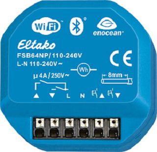 Funk-Jalousie- und Rollladen-Aktor 1+1 Schließer 4A/250V AC, nicht potenzialfrei, für einen Beschattungselemente-Motor 110-240 V AC. Stand-by-Verlust nur 0,9 Watt. Für Einbaumontage. 49x51mm, 23mm tief. Die Anschlussklemmen sind Steckklemmen für Leiterquerschnitte von 0,2mm² bis 2,5mm². Mit der komfortablen Tipp-Technik können Funk-Universaltaster, Funk-Richtungstaster und Funk-Zentralsteuertaster eingelernt werden. Es kann zwischen den Funktionen GR, GS1, Zentraltaster mit und ohne Priorität, oder GS2, Zentraltaster ohne Priorität, mit Doppelklick-Wendefunktion oder Tipp-Wendefunktion gewählt werden. Bidirektionaler Funk und Repeater-Funktion aktivierbar. Kontaktschaltung im Nulldurchgang. Versorgungs-, Schalt- und Steuerspannung örtlich 110-240V. Beim Ausfall der Versorgungsspannung wird definiert ausgeschaltet. Zusätzlich zum Funk-Steuereingang über eine innenliegende Antenne kann dieser Funk-Aktor auch mit einem eventuell davor montierten konventionellen Steuertaster örtlich gesteuert werden. Entweder getrennte örtliche Steuereingänge für Auf und Ab als Richtungstaster, oder diese zwei Eingänge werden gebrückt und mit einem Einzeltaster als Universaltaster gesteuert. Dann erfolgt die Richtungsänderung durch eine Unterbrechung der Ansteuerung. Ein Glimmlampenstrom ist nicht zugelassen. Dank eigener IP-Adresse ist auf Wunsch auch der Fernzugriff über das Internet möglich, denn es ist ein IoT-Produkt neuester Generation. Bluetooth ist ebenfalls an Bord. Für den reinen Offlinebetrieb können WiFi, Bluetooth und EnOcean vollkommen deaktiviert werden. Weiterentwickelte Firmware kann über ein Smartphone und das Internet per WiFi eingespielt werden. Per Backup lassen sich alle Einstellungen speichern und bei Bedarf auch in andere Aktoren gleicher Type einspielen. Dieser Aktor ist Apple-zertifiziert und kann daher in Apple HomeKit eingelernt werden. Auch in Google Assistant, Amazon Alexa und andere Systeme kann er nach einem Firmwareupdate eingelernt werden. Er ist mit einem Mess-IC für die Leistungsmessung des angeschlossenen Verbrauchers ausgestattet. Mit der Eltako-App lassen sich die Funktionen des Smart Home per Smartphone schnell und einfach einstellen, auslösen und steuern