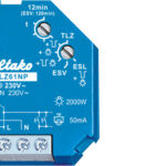 1 Schließer nicht potenzialfrei 16A/250V AC, 230V-LED-Lampen bis 600W, ESL bis 200W, Glühlampen bis 2300W. Steuerspannung 230V und/oder 8..230V UC. Ausschaltvorwarnung und Taster-Dauerlicht zuschaltbar. Stand-by-Verlust nur 0,7 Watt. Mit ESL-Optimierung und Multifunktion. Reiheneinbaugerät für Montage auf Tragschiene DIN-EN 60715 TH35. 1 Teilungseinheit = 18mm breit, 58mm tief. Kontaktschaltung im Nulldurchgang zur Schonung der Kontakte und Lampen. Die geräuschlose Elektronik belästigt nicht das empfindlichste Ohr – ganz im Gegensatz zu vielen Synchronmotoren mit mechanischem Getriebe. Durch die Verwendung eines bistabilen Relais gibt es auch im eingeschalteten Zustand keine Spulen-Verlustleistung und keine Erwärmung hierdurch. Nach der Installation die automatische kurze Synchronisation abwarten, bevor der geschaltete Verbraucher an das Netz gelegt wird. Steuer-, Versorgungs- und Schaltspannung 230V. Zusätzlich mit galvanisch getrennter Universal-Steuerspannung 8..230 V UC. Für 3- und 4-Leiter-Schaltungen, nachschaltbar, mit Dachbodenbeleuchtung bei 4-Leiter-Schaltung. Automatische Erkennung der Schaltungsart. Glimmlampenstrom bis 50mA, abhängig von der Zündspannung der Glimmlampen. Genaue Zeiteinstellung 1 bis 30 Minuten mit Minutenskala. Dauerlicht-Schalter mit dem großen Drehschalter. Nach einem Stromausfall in der Funktionseinstellung TLZ wird die Beleuchtung wieder eingeschaltet, wenn der Zeitablauf noch nicht beendet war. Mit Doppelanschlüssen für Taster und Lampe, damit wahlweise oben und unten oder nur unten angeschlossen werden kann. Bei zugeschalteter Ausschaltvorwarnung flackert die Beleuchtung ca. 30 Sekunden vor Zeitablauf beginnend und insgesamt 3-mal in kürzer werdenden Zeitabständen. Bei zugeschaltetem Taster-Dauerlicht kann durch Tasten länger als 1 Sekunde auf Dauerlicht gestellt werden, welches nach 60 Minuten automatisch ausgeschaltet wird oder mit Tasten länger als 2 Sekunden ausgeschaltet werden kann. Sind Taster-Dauerlicht und Ausschaltvorwarnung zugeschaltet, erfolgt nach dem Ausschalten des Dauerlichtes erst die Ausschaltvorwarnung. Werden ganz oder teilweise Energiesparlampen ESL geschaltet, dann die Ausschaltvorwarnung und das Taster-Dauerlicht auf der rechten ESL-Seite des Drehschalters einstellen. Innerhalb der ersten Sekunde nach dem Einschalten oder Nachschalten kann bei den TLZ-Funktionen die Zeit durch bis zu 3-maliges kurzes Tasten verlängert werden (pumpen). Jedes Tasten addiert 1-mal die eingestellte Zeit hinzu. Mit Multifunktion: Umschaltbar auf die Funktionen ES (Stromstoßschalter), ER (Relais) und ESV (Stromstoßschalter mit Rückfallverzögerung). In der Funktion ESV entsprechen die mit dem mittleren Drehschalter einstellbaren Zeiten (t) folgenden Werten: 1 = 2 min, 2 = 5 min, 3 = 10 min, 4 = 15 min, 6 = 25 min, 8 = 35 min, 10 = 45 min, 12 = 60 min, 20 = 90 min, 30 = 120 min. Nach Ablauf der eingestellten Verzögerungszeit wird automatisch ausgeschaltet, wenn der manuelle Aus-Befehl nicht gegeben wurde. Ausschaltvorwarnung und Taster-Dauerlicht sind auch bei ESV zuschaltbar. Vergessenes Dauerlicht wird nach 2 Stunden ausgeschaltet.
