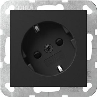 SCHUKO-Steckdose 16 A 250 V~ mit um 30° gedrehtem Einsatz und erhöhtem Berührungsschutz (Safety Plus), ohne Befestigungskrallen Schwarz matt (lackiert) System 55 Merkmale: Speziell geeignet für Winkelstecker. Auch zum Einsatz in Gira Energiesäule und Unterflursysteme. Für Schraubbefestigung. Hinweise: Mit erhöhtem Anpressdruck des Erdungsbügels geprüft nach T.N.O. Erhöhter Berührungsschutz (Safety Plus) gemäß DIN VDE 0620-1.