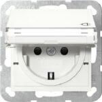SCHUKO-Steckdose 16 A 250 V~ mit Klappdeckel, Beschriftungsfeld und erhöhtem Berührungsschutz (Safety Plus) Farbe Alu System 55 Merkmale: Tragring ist in Verbindung mit den Befestigungskrallen und Krallenschrauben geerdet. Schnellbefestigung (ca. 3,5 Umdrehungen pro Befestigungskralle). Eingehauste Spreizkrallen. Einfachere Krallenbefestigung durch robusten Schraubenkopfantrieb PZ1 / Schlitz / PH. Vereinfachte Installation durch patentierte Anordnung der großen Schlüssellochprofile mittels Dosenschrauben. Geringe Einbautiefe. Große, ergonomisch geformte Lösehebel. Stabiler Erdungsbügel mit massiven Erdungsfingern. Stabiler und korrosionsbeständiger Stahltragring. Bruchsicherer Thermoplastsockel