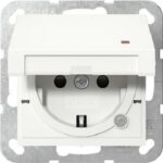 SCHUKO-Steckdose 16 A 250 V~ mit Klappdeckel, orangem Kontrolllicht und erhöhtem Berührungsschutz (Safety Plus) Farbe Alu System 55 Merkmale: Tragring ist in Verbindung mit den Befestigungskrallen und Krallenschrauben geerdet. Schnellbefestigung (ca. 3,5 Umdrehungen pro Befestigungskralle). Eingehauste Spreizkrallen. Einfachere Krallenbefestigung durch robusten Schraubenkopfantrieb PZ1 / Schlitz / PH. Vereinfachte Installation durch patentierte Anordnung der großen Schlüssellochprofile mittels Dosenschrauben. Geringe Einbautiefe. Große, ergonomisch geformte Lösehebel. Stabiler Erdungsbügel mit massiven Erdungsfingern. Stabiler und korrosionsbeständiger Stahltragring. Bruchsicherer Thermoplastsockel