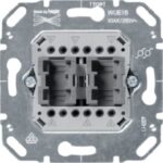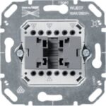 Wippschalter-Einsatz, Ausschalter 3-polig, 10 AX, 250 V AC. Ausschalter 3-polig, verwindungsfester, entgrateter und Oberflächen veredelter Metalltragring mit Justierhilfe. Kompakte Bauform mit geringer Einbautiefe und komplett versenkten Befestigungskrallen. Keine elektrische leitende Verbindung zwischen Metalltragring und Befestigungskrallen. Krallenbefestigung mit Schnell-Gang-Gewindeschraube und Rückführungsmechanik. Ohne Schalterausbau: Nachrüstung von steckbarer Beleuchtung sowie beschriftete Prüfkontakt zur Spannungsmessung. Leitungsanschluss im 45 Grad Winkel mit Einführungshilfe