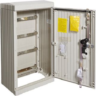 Kabelverteilerschrank Gr.00/845, mit SaS 4xCu 30x6mm, 845x480x315mm (HxBxT). Kabelverteilerschrank nach DIN EN 61439, Schutzart IP 44, aus glasfaserverstärktes Polyester FS 833.5 nach DIN EN 14598. Kabelverteilerschrank als Leerschrank, Schrank mit Montageplatte (PVC) oder Schrank mit Sammelschienen-System zum Einbau von NH-Sicherungslastschaltleisten. Profiliertes Gehäuse im Rippendesign. Tür mit Öffnungswinkel 180 Grad bei freiem Stand und 90 Grad bei angereihten Gehäusen. Rechte Tür ist aushängbar. Schließung mit Schwenkhebel, Drei-Punkt-Basküleverschluss, Doppelschließung, ein Profilhalbzylindern ist eingebaut. Schränke der Größe 2 können mit zwei voneinander unabhängig verschließbaren Türen versehen werden. Die Belüftung erfolgt über labyrinthartig ausgebildete Lüftungskanäle und ist durch Eindringen von Fremdkörpern stochersicher