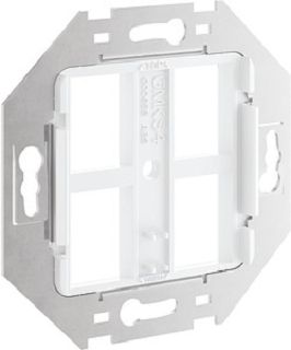 Montagerahmen Keystone 4-fach, f. Zentralscheibe UAE 4-fach, hfr, reinweiß. Montagerahmen zur Aufnahme von vier Keystone Einsätzen mit einer jeweils maximalen Modulbreite von 14,7 mm. Zum Einbau in anreihbare Gerätedosen für Brüstungskanäle, mit reduzierter Einbautiefe zum bündigen Abschluß mit der Verschlußkontur des Brüstungskanals. Zur Verwendung mit Zentralscheiben für Montagerahmen Keystone 4-fach mit Maß 55 x 55 mm