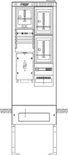Zähleranschlusssäule 205, universN, 2 Zählerplätze, 3-Punkt, 4-polig, Leerplatz.Bestückte Zähleranschlusssäule nach DIN EN 61439, Schutzart IP 44, mit Eingrabsockel, aus glasfaserverstärktes Polyester FS 833.5 nach DIN EN 14598. Zähleranschlusssäule ist nach den aktuellen technischen Anschlussbedingungen des jeweiligen Energieversorgers bestückt und deckt die jeweiligen TAB-Anforderungen ab. Profiliertes Gehäuse im Rippendesign. Tür mit Öffnungswinkel 180 Grad bei freiem Stand und 90 Grad bei angereihten Gehäusen. Rechte Tür ist aushängbar. Schließung mit Schwenkhebel und Drei-Punkt-Basküleverschluss mit 1 bzw. 2 Profilhalbzylindern. Eingebauter Zylinder unten mit gleichschließender Serie. Ein zweiter Schließzylinder (z. B. aus VNB-Schließanlage) kann oben nach Entfernen des Vierkantverschlusses eingebaut werden. Wenn kein zweiter Profilhalbzylinder eingebaut wird, muss die zweite obere Öffnung mit einem Blindverschluss bestückt werden. Die Belüftung erfolgt über labyrinthartig ausgebildete Lüftungskanäle und ist durch Eindringen von Fremdkörpern stochersicher. Zähleranschlusssäulen sind gebaut nach technischer Richtlinie Anschlussschränke im Freien/Anschluss von ortsfesten Schalt- und Steuerschränken und Zähleranschlusssäulen an das Niederspannungsnetz des VNB. Der Einbau besteht aus schutzisolierten Zählerfeldern DIN 43870 (Funktionsflachen) für Zähler und Tarifschaltgerät (TSG). Zählerplätze bzw. TSG- Platz sind vorgerichtet mit einer IP54 Abdeckung. Je nach Ausführung sind Leerplätze als Nachrüstfelder vorgesehen. Eingrabsockel und Zähleranschlusssäule bilden eine Einheit. Ein Bodenrost ist empfohlen. Zur Betauungsvermeidung ist der Sockel bis zur Höhe der Kabelbefestigungsschiene innen mit Sockelfüller aufzufüllen