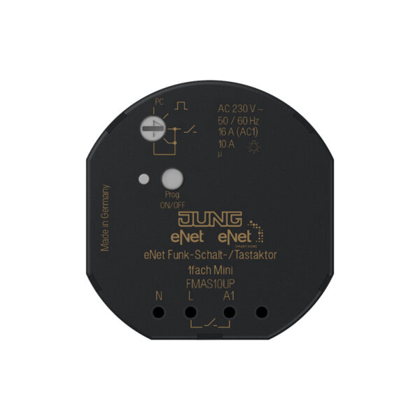 neue Systemfunktion: vollverschlüsselte Funkübertragung (AES-CCM) ab eNet Server Softwareversion 2.0 Bestimmungsgemäßer Gebrauch Schalten von Beleuchtung Bedienung mit geeigneten eNet-Funksendern Montage in Gerätedose nach EN 60670-1 in Kombination mit einer geeigneten Abdeckung Montage in Aufputzgehäuse oder Einbauadapter (Art.-Nr. FM-EBG) für Zwischendecken Produkteigenschaften Betriebsartenschalter zur Schalt-/Tastaktor-Umschaltung oder Parametrierung über eNet-Server Statusrückmeldung an Funksender Szenenbetrieb möglich Ausgang mit Taste Prog schaltbar Statusanzeige mit LED Schaltbetrieb: Einschalttelegramm: Gerät schaltet ein Ausschalttelegramm: Gerät schaltet aus   Tastbetrieb: Der Relaiskontakt bleibt so lange geschlossen wie Ein- oder Ausschalttelegramme empfangen werden Die maximale Einschaltdauer beträgt 60 Sekunden   Mit eNet-Server einstellbar: Blinkfunktion Nachlaufzeit Ein-/ Ausschaltverzögerung Schließer- oder Öffnerbetrieb Abschaltvorwarnung Minimale Schaltwiederholzeit Bediensperren Dauer-Ein, Dauer-Aus Zusatzfunktionen mit eNet-Server: Vollverschlüsselte Funkübertragung (AES-CCM) ab eNet Server Softwareversion 2.0 Update der Gerätesoftware Repeaterfunktion Fehlerspeicher auslesen Nennspannung: AC 230 V ~, 50/60 Hz Umgebungstemperatur: ?25 … +70 °C Schaltstrom bei 35 °C Ohmsch: 16 A (AC1) Bei Schaltstrom > 10 A Anschlussleitung 2,5 mm2 Leuchtstofflampen: 4 AX Kontaktart: µ Standby-Leistung: 0,5 W Anschlussleistung bei 35 °C Glühlampen: 2300 W HV-Halogenlampen: 2000 W Elektronische Trafos: 1500 W Induktive Trafos: 1000 VA HV-LED-Lampen: typ. 500 W Kompaktleuchtstofflampen: typ. 500 W Leuchtstofflampen unkompensiert: 920 VA Kapazitive Last: 690 VA (560 µF) Anschlussart: Schraubklemmen eindrähtig: 1 x 0,75 … 4 mm2 feindrähtig mit Aderendhülse: 1 x 0,75 … 2,5 mm2 Maße (Ø x H): 53 x 28 mm Funkfrequenz: 868,0 … 868,6 MHz Sendeleistung: max. 20 mW Sendereichweite im Freifeld: typ. 100 m Empfängerkategorie: 2