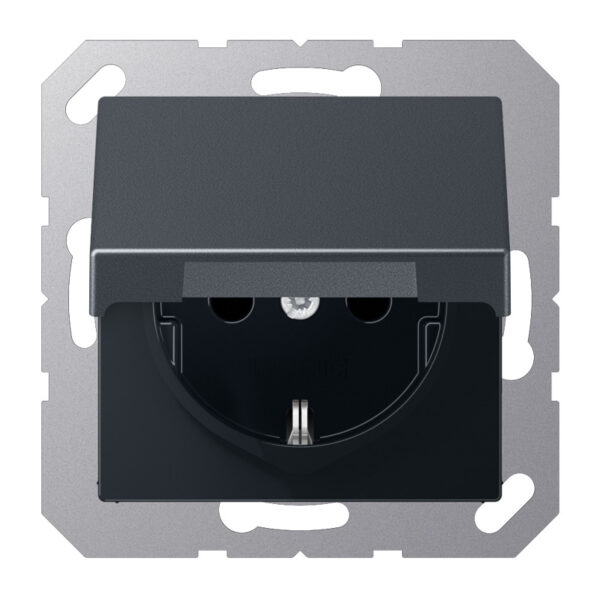 SCHUKO® Steckdose, anthrazit matt mit Klappdeckel (mit Rückstellfeder) mit Federklemmen für starre und unbehandelte flexible Leiter bis 2,5 mm2 Verbindungsklemmen nach DIN VDE 0620 Tragring, Krallen und Krallenschrauben sind über eine Erdungsschiene in die Schutzmaßnahme eingebunden. Material: Thermoplast lackiert Maße (B x H): 55 x 55 mm