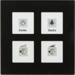 KNX Glastaster Plus 4-fach, Weiß, mit Temperatursensor. Ausführung mit 4 Sensorflächen, Temperatursensor und LEDs für Betriebs-/Statusanzeige. Mit Temperatursensor zur Erfassung der Raumtemperatur. Die Tasten sind als Tastenpaar oder Einzeltasten frei einstellbar. Werte senden, Zwangsführung und Schaltbefehle einstellbar. Kurzer/Langer Tastendruck mit 2 Objekten. Umlaufendes Orientierungslicht. Weiße/Rote LED je Sensorfläche. LED Helligkeit über Tag/Nacht-Objekt in 5 Stufen einstellbar. Ein- und Zweitasterbetrieb für Dimmer/Jalousiefunktionen. Beschriftungsfolie zum Einschieben unter die Glasfläche. Einbau in Schalterdose, Lieferung mit Beschriftungsfolie. Abmessungen (H x B): 92 x 92 mm. Integrierter Busankoppler. 3 Jahre Produktgarantie.