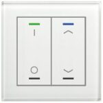KNX Glastaster II Light 2-fach, RGBW, Temperatursensor, Weiß, Jalousie_Schalten. Ausführung Auf/Ab und I/O Symbol mit 2 Tastenpaaren / 4 Sensorflächen und Temperatursensor. Umfangreiche Applikation. Die Tasten sind als Tastenpaar oder Einzeltasten frei einstellbar. Ein- und Zweitasterbetrieb für Schalten, Dimmen, Jalousie, Werte. Umschalten von bis zu vier Werten oder Szenen. Kurzer/Langer Tastendruck mit 2 Objekten. Mehrfach-Tippfunktion sendet bis zu 4 Werte auf gleiche oder verschiedene Objekte. Innovative Gruppensteuerung mit langem/extra langem Tastendruck. Patschfunktion mit zusätzlichem Schaltobjekt. Vier RGBW Status-LEDs. LED Helligkeit über Tag/Nacht- oder Helligkeit-Objekt steuerbar. 4 Logikblöcke. Einbau in Schalterdose mit mitgeliefertem Tragring. Abmessungen (H x B): 92 x 92 mm. Integrierter Busankoppler. 3 Jahre Produktgarantie.