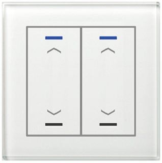 KNX Glastaster II Light 2-fach, RGBW, Weiß, Jalousie. Ausführung Auf/Ab Symbol mit 2 Tastenpaaren / 4 Sensorflächen. Umfangreiche Applikation. Die Tasten sind als Tastenpaar oder Einzeltasten frei einstellbar. Ein- und Zweitasterbetrieb für Schalten, Dimmen, Jalousie, Werte. Umschalten von bis zu vier Werten oder Szenen. Kurzer/Langer Tastendruck mit 2 Objekten. Mehrfach-Tippfunktion sendet bis zu 4 Werte auf gleiche oder verschiedene Objekte. Innovative Gruppensteuerung mit langem/extra langem Tastendruck. Patschfunktion mit zusätzlichem Schaltobjekt. Vier RGBW Status-LEDs. LED Helligkeit über Tag/Nacht- oder Helligkeit-Objekt steuerbar. 4 Logikblöcke. Einbau in Schalterdose mit mitgeliefertem Tragring. Abmessungen (H x B): 92 x 92 mm. Integrierter Busankoppler. 3 Jahre Produktgarantie.