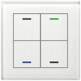 KNX Glastaster II Light 4-fach, RGBW, Temperatursensor, Weiß, Neutral. Ausführung Neutral mit 4 Sensorflächen und Temperatursensor. Umfangreiche Applikation. Die Tasten sind als Tastenpaar oder Einzeltasten frei einstellbar. Ein- und Zweitasterbetrieb für Schalten, Dimmen, Jalousie, Werte. Umschalten von bis zu vier Werten oder Szenen. Kurzer/Langer Tastendruck mit 2 Objekten. Mehrfach-Tippfunktion sendet bis zu 4 Werte auf gleiche oder verschiedene Objekte. Innovative Gruppensteuerung mit langem/extra langem Tastendruck. Patschfunktion mit zusätzlichem Schaltobjekt. Vier RGBW Status-LEDs. LED Helligkeit über Tag/Nacht- oder Helligkeit-Objekt steuerbar. 4 Logikblöcke. Einbau in Schalterdose mit mitgeliefertem Tragring. Abmessungen (H x B): 92 x 92 mm. Integrierter Busankoppler. 3 Jahre Produktgarantie.