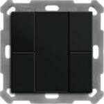 KNX Taster 55 6-fach, Schwarz matt. Ausführung mit 6 Tasten. Passend für 55 mm Schalterprogramme z. B. MDT Sortiment 55 oder GIRA E2 oder BERKER B3, B7 oder JUNG A 550 oder Merten M-Pure. Mittiges Schriftfeld mit Deckfolie zur individuellen Beschriftung. Die Tasten sind als Tastenpaar oder Einzeltasten frei einstellbar. Ein- und Zweitasterbetrieb für Schalten, Dimmen, Jalousie, Werte. Innovative Gruppensteuerung mit langem/extra langem Tastendruck. Umschalten von bis zu vier Werten oder Szenen. Kurzer/Langer Tastendruck mit 2 Objekten. 4 Logikblöcke. Einbau in Schalterdose mit mitgeliefertem Tragring. Integrierter Busankoppler. 3 Jahre Produktgarantie.