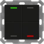 KNX Taster Light 55 1-fach, RGBW, Schwarz matt, Neutral. Ausführung mit 1 Tastenpaar / 2 Tasterflächen. Passend für 55 mm Schalterprogramme z. B. MDT Sortiment 55 oder GIRA Standard 55, E2, Event, Esprit oder BERKER S1, B3, B7 oder JUNG A 500, A PLUS, A CREATION, AS 500, A 550, A FLOW oder MERTEN 1M, M-Smart, M-Plan, M-Pure. Die Tasten sind als Tastenpaar oder Einzeltasten frei einstellbar. Ein- und Zweitasterbetrieb für Schalten, Dimmen, Jalousie, Werte. Umschalten von bis zu vier Werten oder Szenen. Kurzer/Langer Tastendruck mit 2 Objekten. Innovative Gruppensteuerung mit langem/extra langem Tastendruck. Mehrfach-Tippfunktion sendet bis zu 4 Werte auf gleiche oder verschiedene Objekte. Zwei RGBW Status-LEDs pro Tastenpaar. LED Helligkeit über Tag/Nacht- oder Helligkeit-Objekt steuerbar. 4 Logikblöcke. Einbau in Schalterdose mit mitgeliefertem Tragring. Integrierter Busankoppler. 3 Jahre Produktgarantie.