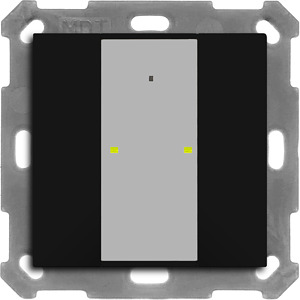 KNX Taster Plus 55 2-fach, Schwarz matt. Ausführung mit 2 Tasten und LEDs für Betriebs-/Statusanzeige und Orientierungslicht. Passend für 55 mm Schalterprogramme z. B. MDT Sortiment 55 oder GIRA E2 oder BERKER B3, B7 oder JUNG A 550 oder Merten M-Pure. Mittiges Schriftfeld mit Deckfolie zur individuellen Beschriftung. Die Tasten sind als Tastenpaar oder Einzeltasten frei einstellbar. Ein- und Zweitasterbetrieb für Schalten, Dimmen, Jalousie, Werte. Innovative Gruppensteuerung mit langem/extra langem Tastendruck. Umschalten von bis zu vier Werten oder Szenen. Kurzer/Langer Tastendruck mit 2 Objekten. 4 Logikblöcke. 2 Betrieb/Status-LEDs (Rot/Grün) und Orientierungslicht unabhängig ansteuerbar. Schaltobjekt zur Steuerung der LED-Priorität. Einbau in Schalterdose mit mitgeliefertem Tragring. Integrierter Busankoppler. 3 Jahre Produktgarantie.