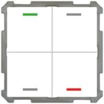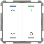 KNX Taster Light 63 2-fach, RGBW, Studioweiß glänzend, Schalten_Jalousie. Ausführung I/O und Auf/Ab Symbol mit 2 Tastenpaaren / 4 Tasterflächen. Passend für 63 mm Schalterprogramme, z. B. MDT Sortiment 63 oder Busch-Jaeger future linear, solo, carat und Busch-axcent. Die Tasten sind als Tastenpaar oder Einzeltasten frei einstellbar. Ein- und Zweitasterbetrieb für Schalten, Dimmen, Jalousie, Werte. Umschalten von bis zu vier Werten oder Szenen. Kurzer/Langer Tastendruck mit 2 Objekten. Innovative Gruppensteuerung mit langem/extra langem Tastendruck. Mehrfach-Tippfunktion sendet bis zu 4 Werte auf gleiche oder verschiedene Objekte. Zwei RGBW Status-LEDs pro Tastenpaar. LED Helligkeit über Tag/Nacht- oder Helligkeit-Objekt steuerbar. 4 Logikblöcke. Einbau in Schalterdose mit mitgeliefertem Tragring. Integrierter Busankoppler. 3 Jahre Produktgarantie.