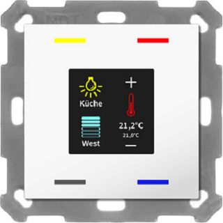 KNX Taster Smart 55 4-fach mit Farbdisplay und T-/F-Sensor, Reinweiß glänzend. Ausführung mit 4 Tasterflächen und Temperatur-/Feuchtesensor. Passend für 55 mm Schalterprogramme z. B. MDT Sortiment 55 oder GIRA Standard 55, E2, Event, Esprit oder BERKER S1, B3, B7 oder JUNG A 500, A PLUS, A CREATION, AS 500, A 550, A FLOW oder MERTEN 1M, M-Smart, M-Plan, M-Pure. Aktives Farbdisplay zur Funktions- und Statusanzeige. Hintergrundfarbe und Helligkeit des Displays einstellbar (weiß oder schwarz). Displayhelligkeit über Helligkeits- und Tag/Nacht-Objekt einstellbar. Anzeige von Innen-/Außentemperatur und Uhrzeit. Mehrfach-Tippfunktion sendet bis zu 4 Werte auf gleiche oder verschiedene Objekte. Innovative Gruppensteuerung mit langem/extra langem Tastendruck. Ein- und Zweitasterbetrieb für Schalten, Dimmen, Jalousie, Werte. Einstellbare Symbole und Texte für jede Taste/Funktion. Kurzer/Langer Tastendruck mit 2 Objekten. Temperatursensor zur Erfassung der Raumtemperatur. Zusätzliche Funktion zur Einstellung von Temperatur und Betriebsart. Keine zusätzliche Spannungsversorgung erforderlich. Einbau in Schalterdose mit mitgeliefertem Tragring. Empfohlene Montagehöhe: 1,05 … 1,20 m. Integrierter Busankoppler. 3 Jahre Produktgarantie.