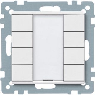 Im Design System M. Mit integriertem Busankoppler. Taster mit 8 Bedientasten, Betriebs-, Statusanzeige und Schriftfeld. Die Betriebsanzeige kann auch als Orientierungslicht verwendet werden. Das Gerät wird über eine Busanschlussklemme mit der Busleitung verbunden. Softwarefunktionen KNX Schalten, Umschalten, Dimmen (ein-/zweiflächig), Jalousie (ein-/zweiflächig). Flanken löst 1,- 2-, 4- oder 8-Bit-Telegramme aus (Unterscheidung kurze/lange Betätigung). Flanken mit 2-Byte-Telegrammen (Unterscheidung kurze/lange Betätigung), 8-Bit-Schieberegler, Szenenabruf, Szenenspeicherung, Sperrfunktionen. Zubehör Beschriftungsbogen für Taster 6183xx Lieferumfang Mit Putzschutzhaube. Mit Busanschlussklemme. Material Thermoplast edelmatt. Farbe polarweiß.