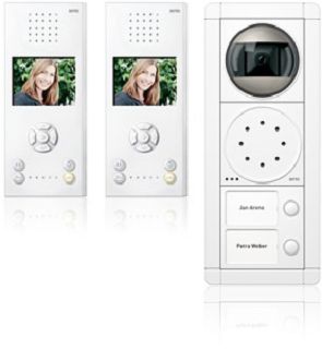 Video-Türsprechanlage mit Portier Modul Türstation in silber oder weiß im Komplettpaket für das Zweifamilienhaus. Inhalt -Rahmen AP 3fach 18833xx -Kameramodul Color mechanisch einstellbar 18789xx (Gesamterfassungsbereich 150 Grad). Türsprechmodul 18759xx -Tastenmodul mit 2 Klingeltasten und Namensschildern (beleuchtet) 18752xx -2 Video-Freisprechstellen Color RGE1787770, weiß. Netzgerät 1757301. Video-Netzgerät RGE1648102. Farbe weiß/weiß.