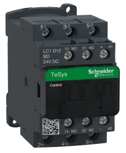 Leistungsschütz TeSys LC1D. 3 polig, 3 Schließer. Zusätzliche Hilfskontakte- 1 Schließer + 1 Öffner, Bemessungsbetriebsleistung bei AC-3, 400 V 5.5 kW, Bemessungsbetriebsstrom Ie bei AC-3, 400 V 12 A, Spule 24 V DC. Abmessung (BxHxT) 45x77x95 mm, Gewicht 0,485 kg. Kategorie AC-1, AC-4, AC-3. mit integraler Unterdrückungseinheit. Schnelle und einfache Einrichtung. Sichere und langlebige Stromverbindung mit Everlink und Federklemmen. Geeignet für Sicherheitsanwendungen durch mechanisch gekoppelte Kontakte und Spiegelkontakte. Zertifizierungen nach BV, CSA, DNV, RINA, GL, GOST, LROS (Lloyds register of shipping), CCC, UL. Produktstandards gem.