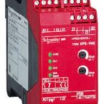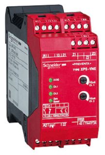 Preventa Sicherheitsrelais XPS. Dieses Sicherheitsrelais dient zur Erkennung des Motorstillstandes durch Messung der Remanenzspannung. Der dreiphasige Motor muss an einer Netzfrequenz bis max. 60 Hz betrieben werden. Das Gerät erfüllt die Anforderungen des Sicherheitsniveaus bis PL d in Kategorie 3 und SIL 2. Für Sicherheitsstromkreise steht zwei Relaisschliesserkontakte und zur Meldung zwei Transistorausgänge zur Verfügung. Vier LEDs zeigen den Zustand an. Die Montage erfolgt auf der Hutschiene. Die Versorgungsspannung beträgt 230 VAC und der Leitungsanschluss erfolgt über abziehbare Schraubklemmen
