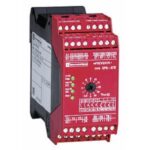 Preventa Sicherheitsrelais XPS. Dieses Sicherheitsrelais dient zur Erkennung des Motorstillstandes durch Messung der Remanenzspannung. Der dreiphasige Motor muss an einer Netzfrequenz bis max. 60 Hz betrieben werden. Das Gerät erfüllt die Anforderungen des Sicherheitsniveaus bis PL d in Kategorie 3 und SIL 2. Für Sicherheitsstromkreise steht zwei Relaisschliesserkontakte und zur Meldung zwei Transistorausgänge zur Verfügung. Vier LEDs zeigen den Zustand an. Die Montage erfolgt auf der Hutschiene. Die Versorgungsspannung beträgt 24 VDC und der Leitungsanschluss erfolgt über festangeschlossene Schraubklemmen
