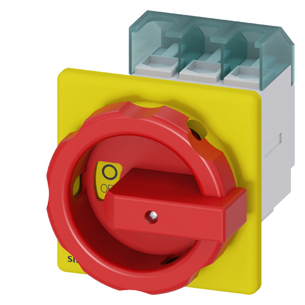 SENTRON, Lasttrennschalter 3LD, Not-Aus-Schalter, 3- polig, Iu: 63 A, Betriebsleistung / bei AC-23 A bei 400V: 22 kW, Frontbefestigt, Drehantrieb, rot/gelb, Zentralbefestigung 22,5mm der Handhabe Haupt- und NOT-AUS-Schalter SENTRON 3LD2 für das sichere Abschalten von Lasten in vielen Bereichen, z.B. für Drehstrommotoren, Klima- und Lüftungsanlagen, in Be- und Verarbeitungsmaschinen des Maschinen- und Förderanlagenbaus, in der chemischen oder in der Nahrungsmittel- und Getränkeindustrie. Modularer Aufbau, schnelle einfache Montage von Hilfsschaltern, N-PE-Klemme oder 4. Pol. Optimale Netztrennung von 16 A bis 250 A durch Abschließbarkeit des Drehantriebes. Schutzart bis IP 65 mit gekapseltem Gehäusefür Anwendungen im Freien. Vielseitig und weltweit einsetzbar dank internationaler IEC-, UL-, CCC- sowie Schiffbau-Approbationen. Die Haupt- und NOT-AUS-Schalter 3LD sind in vielfältigen Varianten erhältlich für Frontbefestigung, Montageplatte, Hutschiene oder Verteilereinbau, wahlweise mit Direkt- oder Türkupplungs-Drehantrieb. Bei 3LD2 sind auch Varianten für Gleichstromanwendungen verfügbar. Haupt- und NOT-AUS-Schalter 3LD – Durchgängige Sicherheit für Anwender und Systeme.