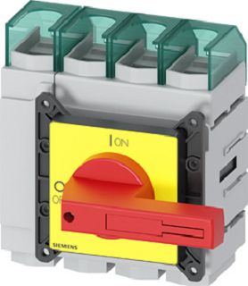 SENTRON, Lasttrennschalter 3LD, Not-Aus-Schalter, 4- polig, Iu: 160 A, Betriebsleistung / bei AC-23 A bei 400V: 75 kW, Frontbefestigt, Knebelantrieb, rot/gelb, 4-Loch Befestigung der Handhabe Haupt- und NOT-AUS-Schalter SENTRON 3LD2 für das sichere Abschalten von Lasten in vielen Bereichen, z.B. für Drehstrommotoren, Klima- und Lüftungsanlagen, in Be- und Verarbeitungsmaschinen des Maschinen- und Förderanlagenbaus, in der chemischen oder in der Nahrungsmittel- und Getränkeindustrie. Modularer Aufbau, schnelle einfache Montage von Hilfsschaltern, N-PE-Klemme oder 4. Pol. Optimale Netztrennung von 16 A bis 250 A durch Abschließbarkeit des Drehantriebes. Schutzart bis IP 65 mit gekapseltem Gehäusefür Anwendungen im Freien. Vielseitig und weltweit einsetzbar dank internationaler IEC-, UL-, CCC- sowie Schiffbau-Approbationen. Die Haupt- und NOT-AUS-Schalter 3LD sind in vielfältigen Varianten erhältlich für Frontbefestigung, Montageplatte, Hutschiene oder Verteilereinbau, wahlweise mit Direkt- oder Türkupplungs-Drehantrieb. Bei 3LD2 sind auch Varianten für Gleichstromanwendungen verfügbar. Haupt- und NOT-AUS-Schalter 3LD – Durchgängige Sicherheit für Anwender und Systeme. Bemessungsdauerstrom bei AC-23, 400 V: 132 A