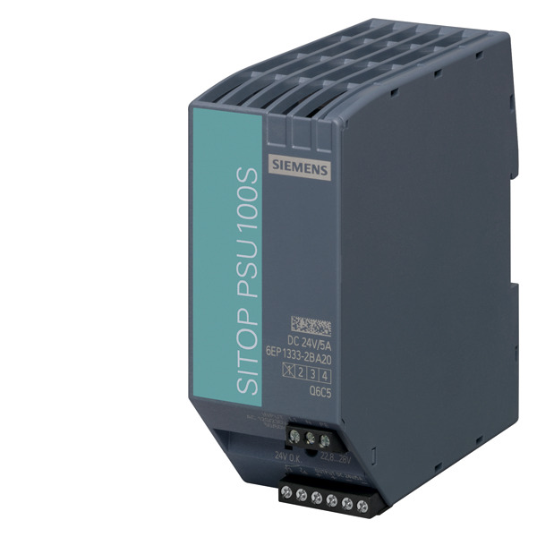 SITOP PSU100S 24 V/5 A Geregelte Stromversorgung Eingang: AC 120/230 V Ausgang: DC 24 V/5 A Die 1-phasigen SITOP smart sind die universellen und leistungsstarken Standardstromversorgungen für den Maschinen- und Anlagenbau. Trotz ihrer kompakten Bauform bieten sie ein hervorragendes Überlastverhalten: Dank Extra-Power von 150% lassen sich Verbraucher mit hohem Stromverbrauch problemlos zuschalten und die dauerhafte Überlastfähigkeit von 120% bietet Leistungsreserven bei Erweiterungen. Der hohe Wirkungsgrad sorgt für niedrigen Energieverbrauch und geringe Wärmeentwicklung im Schaltschrank. Zur weiteren Erhöhung der 24 V-Verfügbarkeit können die SITOP smart Netzteile mit Puffer-, DC-USV-, Redundanz- und Selektivitätsmodulen kombiniert werden. Egal welche Branche, egal welche Anforderung – Siemens bietet zuverlässige und effiziente Stromversorgungen für jede Anlage.