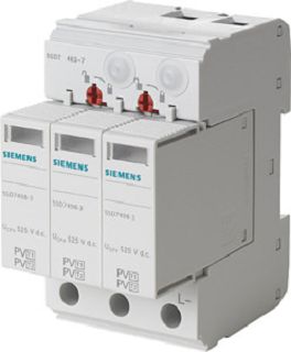 Überspannungsableiter T1/T2, Uc 1050V DC, Imax 40kA Kurzschlussfestigkeit 80A, 2+V Schaltung, für isolierte und geerdete PV-Systeme Überspannungsschutzgeräte zum Schutz vor Überspannungen in elektrischen Anlagen. Die Überspannungsschutzgeräte von Siemens, als wichtiger Bestandteil der SENTRON Schutzkomponenten für die Elektroinstallation, bieten effektiven Schutz bei Blitz und Überspannungen infolge atmosphärischer Einflüsse oder Schaltvorgängen. Komfortable Montage- und Anschlusstechnik sowie ein durchgängiges Design sind die Kennzeichen der Gerätefamilie. Ob für Infrastruktur oder für industrielle Anforderungen, Siemens bietet Überspannungsschutzgeräte für alle Anwendungen und jedes Einsatzgebiet. Die Siemens Überspannungsschutzgeräte zeichnen sich vor allem aus durch: 1. Effektiver Investitions- und Anlagenschutz vor Blitz und Überspannungen. 2. Für jeden Anwendungsfall der richtige Blitz-/ und Überspannungsschutz (Typ1 bis 3). 3. Fernmeldekontakt zum externen Upload der Zustandsanzeige. 4. Zuverlässige Sicherheit bei der Installation dank standardmäßig enthaltenem Umgreif- und Berührungsschutz. 5. Werkzeugloses Lösen von der Hutschiene. 6. Klar ersichtliche Fehleranzeige. 7. Datamatrix-Code vorne am Gerät bietet schnell und einfach alle Infos rund um den Blitz- und Überspannungsschutz. 8. Optimale Technik für Ihre Sicherheit – nur von Siemens. Max